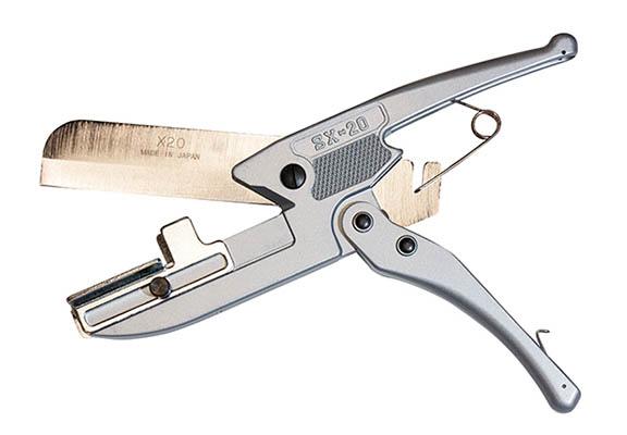 Leikkuri pehmeille materiaaleille pitkällä terällä ja leikkuu-uralla. Leikkuu etenee portaattomasti.